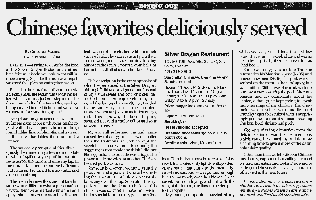 Silver Dragon Chinese Restaurant in Silver Lake is "ONE of the VERY BEST" Chinese restaurants in Everett, WA. A dining experience your taste buds will want to have over and over again. read what The Herald has to say about this restaurant: click here PHONE ORDERS: (425) 316-3600